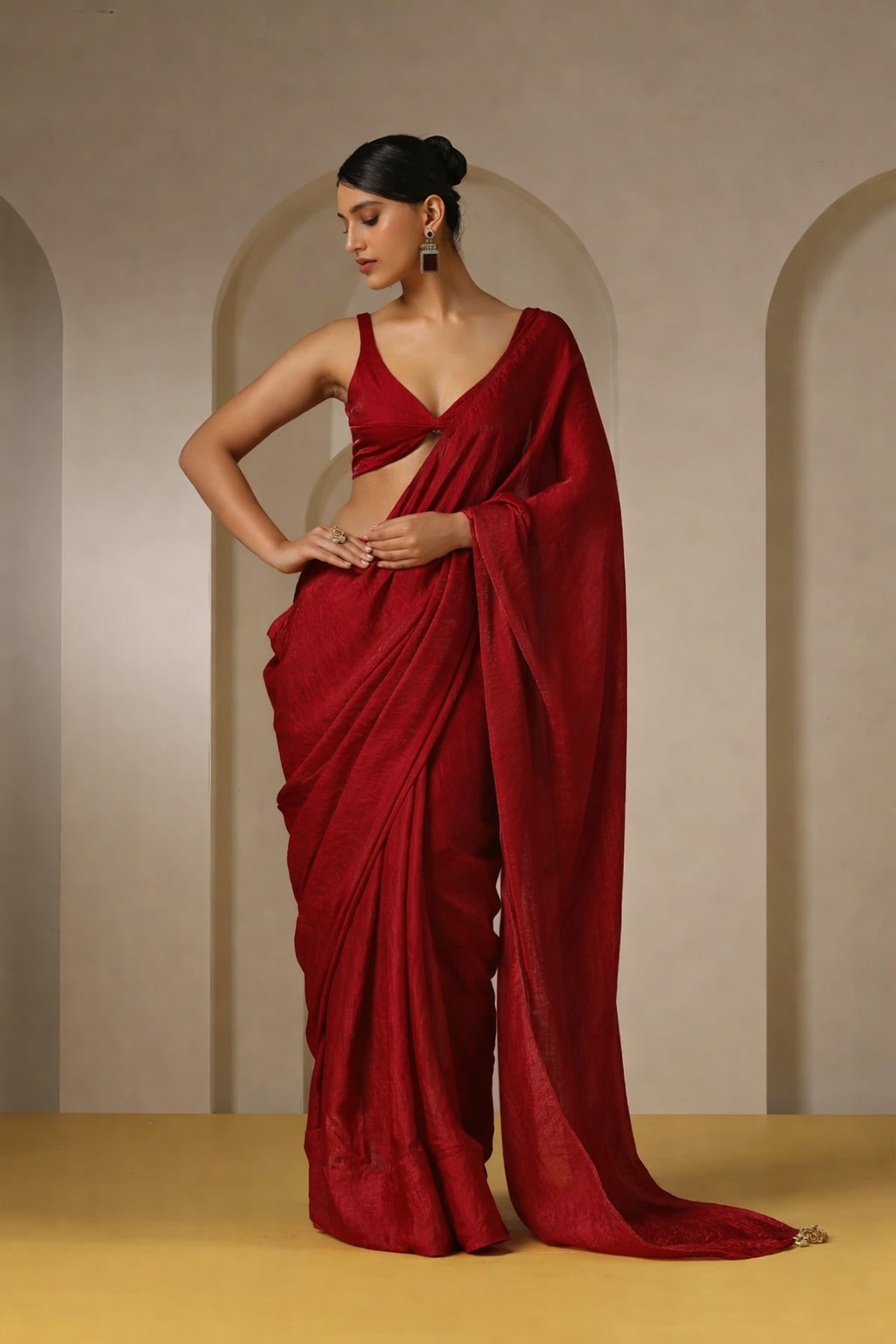 This crushed metallic red satin saree brings together radiant shine and gentle fluidity for gatherings that shimmer into the night. The smooth satin base has a soft metallic finish that reflects light beautifully while the crushed texture adds understated dimension and character to the drape.
