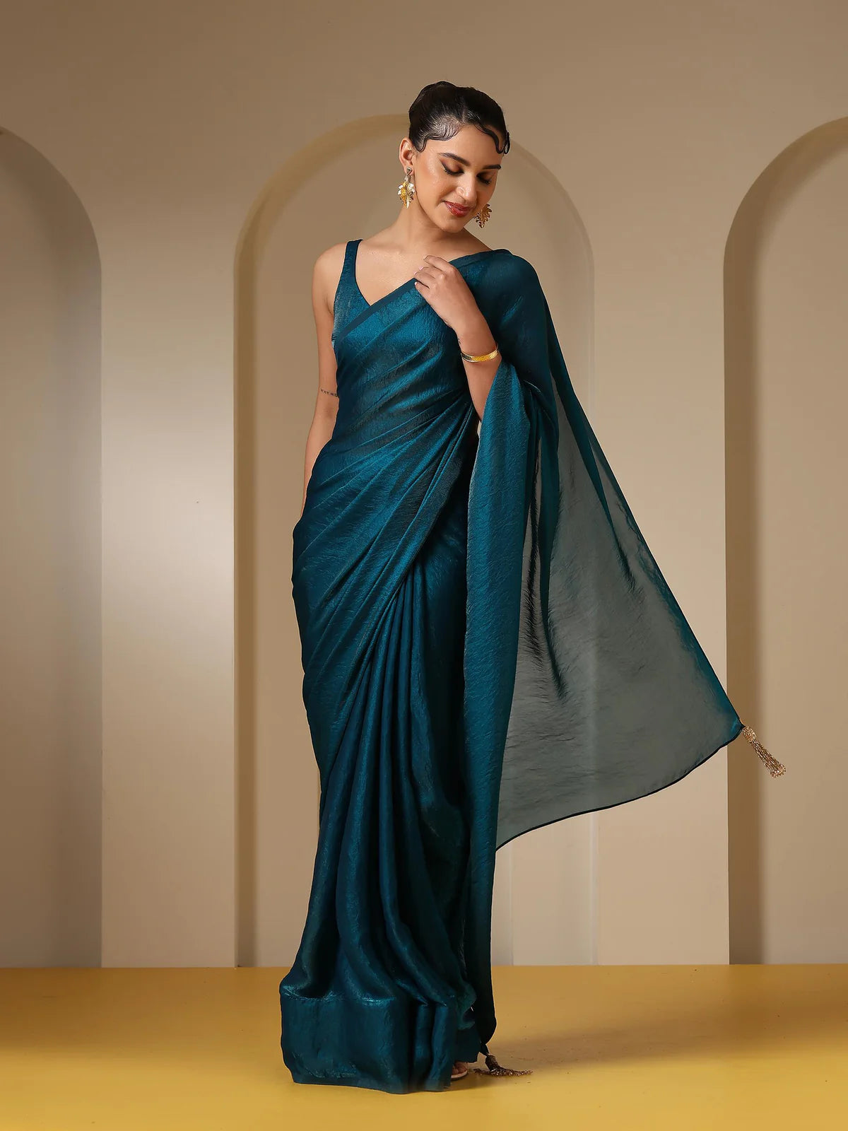 A deep midnight teal satin saree that shimmers with fluid grace, perfect for evening celebrations and festive gatherings.