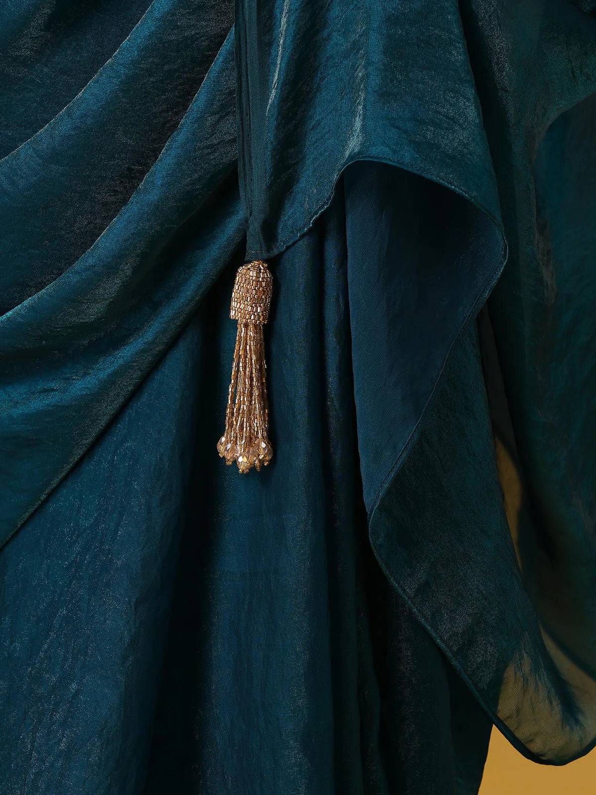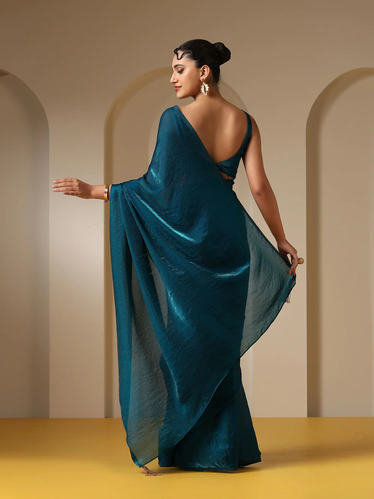 This deep midnight teal satin saree brings together luminous elegance and graceful movement for occasions that linger into the evening. Crafted with a sleek satin base and finished with a subtle metallic sheen, it drapes beautifully to create a silhouette that feels both refined and striking.