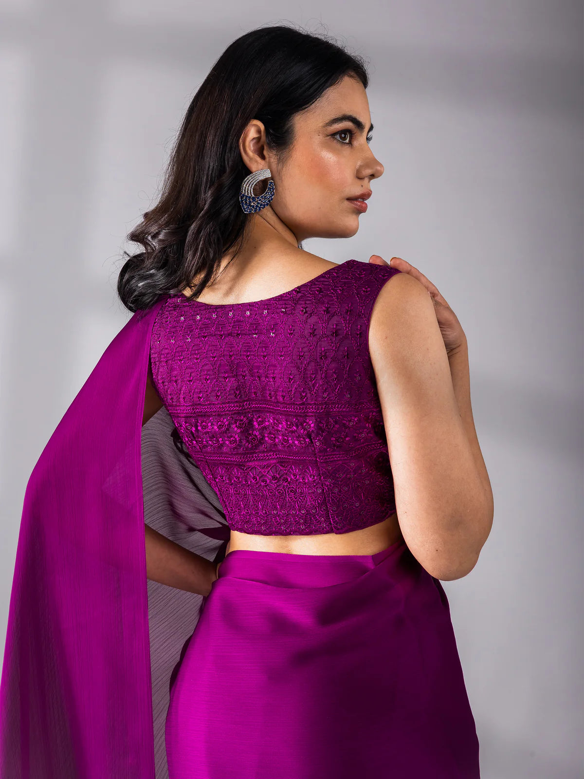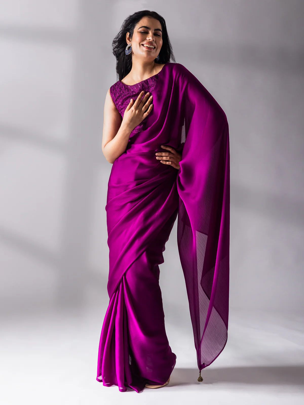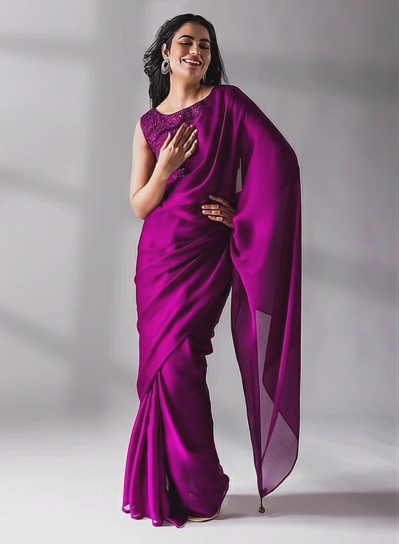 The beauty of this saree lies in its balance — the saree itself remains refined and minimal, while the embroidered blouse elevates the overall look into a complete occasion outfit. The airy chiffon fabric moves beautifully with every step, giving a naturally flattering fall that elongates the silhouette and makes draping extremely easy.